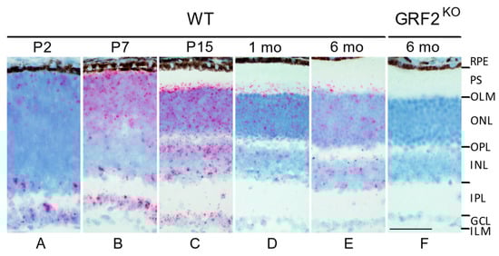 Although we have previously shown the expression of GRF1 and GRF2 at the protein level during the postnatal development of the retina [7], it is widely recognized that the currently available antibodies lack sufficient specificity for accurate immunohistological localization studies of these two structurally related GEFs. Hence, in order to enable a precise, specific detection of GRF2 mRNA expression in the different layers/cell types of the retina, here, we performed in situ hybridization assays using specific probes capable of easily discriminating between potential, partially homologous GRF1 and GRF2 gene products (see Section 2). Thus, consistent with our prior observations via a Western blot analysis [7], we verified that GRF2 mRNA is widely expressed postnatally in the retina of WT mice (Figure 1). In particular, we identified a distinct peak of GRF2 expression at ages P7 and P15 (Figure 1B–C), a temporal window coinciding with the developmental stage at which the nuclei of the cones are physiologically moving toward the apical part of the ONL, close to the OLM [9,10], and also matching the timing of our previously described peak of the detection of ectopic nuclei in GRF2KO retinas [7]. Our in situ assays also showed that GRF2 mRNA expression was maintained, although at more reduced levels, at later ages in the adult WT mice (Figure 1D,E). As a negative control, our assays showed a complete absence of GRF2 signals in the retinas of the GRF2KO mice (Figure 1F). Regarding the outer retina, GRF2 is expressed in both photoreceptor cell types as well as in the Muller cells of WT mice, as shown through the co-localization of the GRF2 probes with peanut agglutinin (PNA) and the glutamate–aspartate transporter (GLAST), respectively (Figure S1).