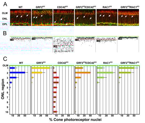 Consistent with our previous report [7], the cone nuclei of the GRF2KO mice aligned closer to the OLM than in the WT animals, even surpassing this limit at times and entering into the photoreceptor segments (PS) layer [7] (Figure 2). In sharp contrast, our analysis of cone nuclei in the CDC42KO retinas revealed that they were spread throughout the outer nuclear layer (ONL) and did not accumulate in the proximity of the OLM, which physiologically happens in the WT retinas (Figure 2). These contrasting nuclear positioning data suggest that GRF2 and CDC42 may play opposite regulatory roles in the control of the process of cone nuclear migration, in accordance with previous reports showing mutually inhibitory functional interactions between these two signaling molecules in other biological contexts [28,29,39,40]. To confirm this view, we crossed GRF2KO animals with CDC42-CRE null mice and analyzed the nuclear movement in the resulting GRF2KO/CDC42KO cone photoreceptors. These experiments showed that these double-knockout (DKO) retinas recovered a normal cone nuclear positioning pattern, with the nuclei aligning close to the OLM layer as in the WT retinas (Figure 2A,B), further supporting the notion of opposed functional roles for GRF2 and CDC42 in the process of cone nuclear migration. Interestingly, the single-knockout RAC1KO retinas displayed a pattern of cone nuclear migration completely similar to that of normal WT retinas, whereas the double-knockout GRF2KO/RAC1KO retinas showed a nuclear migratory phenotype that was undistinguishable from that of the single GRF2KO, suggesting that the defects in nuclei migration in the GRF2KO mice are not mechanistically related to a lack of RAC1 activation, and that RAC1 is not implicated in the regulation of cone nuclear movement in mice (Figure 2).