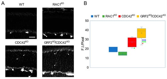 3.3. Opposite Effects of RAC1 and CDC42 Ablation on GRF2-Dependent MLC2 Phosphorylation in the Mouse Retina