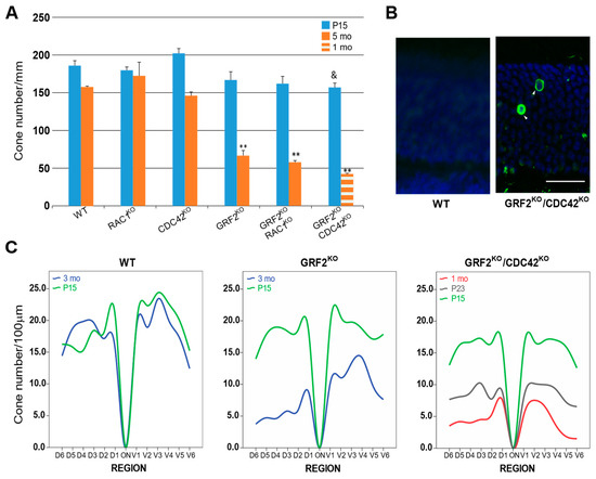 Quantification of cone cell numbers based on CRE expression. (A) Number of CRE+ cells/mm in whole retinal sections. The timepoints compared for all genotypes correspond to P15 (solid blue bars) and 5 months of age (solid brown bars), except for the GRF2KO/CDC42KO mice, where only the P15 (solid blue bars), and 1-month-old timepoints (broken brown bars) were analyzed due to the rapid cone cell death occurring in these animals. (B) Representative TUNEL staining (arrowheads) in WT and GRF2KO/CDC42KO P23 retinas. Scale bar = 20 µm. (C) Number of cone cells in 100 µm stretches of the ONL located in 6 distinct areas of the dorsal and ventral retina, at the indicated (color coded) stages of postnatal development. Due to the varying cell death rates observed in the different genotypes, the time points of the measurements shown here differ depending on the genotypes analyzed. P15 (green line) and 3 months of age (blue line) were analyzed in the WT control retinas and in the GRF2KO, whereas in the GRF2KO/CDC42KO, measurements were performed at P15 (green line), P23 (grey line), and 1 month of age (red line). ** p < 0.01 vs. WT at 5 months and p < 0.05 vs. WT at P15. WT: n = 2 for P15; n = 2 for 3 months old; n = 3 for 5 months old. RAC1KO: n = 2 for P15; n = 3 for 5 months old. CDC42KO: n = 3 for P15; n = 4 for 5 months old. GRF2KO: n = 2 for P15; n = 4 for 3 months old; n = 3 for 5 months old. GRF2KO/RAC1KO: n = 2 for P15; n = 2 for 5 months old. GRF2KO/CDC42KO: n = 5 for P15; n = 3 for P23; n = 2 for 1 month old.