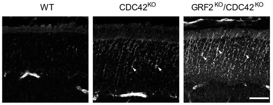 Analysis of VASP phosphorylation in WT, CDC42KO, and GRF2KO/CDC42KO retinas at P15. Representative images showing VASP activation through phosphorylation, as detected using a specific pVASP antibody (arrowheads) in retinas of the indicated genotypes. Scale bar = 20 µm. WT (n = 3); CDC42KO (n = 3); GRF2KO/CDC42KO (n = 4).