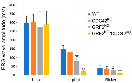 Graphical representation of the electroretinographic data recordings obtained from WT, GRF2KO, CDC42KO, and GRF2KO/CDC42KO mice; b-scot is a measurement of rod function, while b-phot and flicker measure cone function. All recordings were performed at 1 month of age. * p < 0.05; ** p < 0.01; Student’s t-test with Bonferroni post hoc; WT (n = 7); CDC42KO (n = 9); GRF2KO (n = 8); GRF2KO/CDC42KO (n = 7).