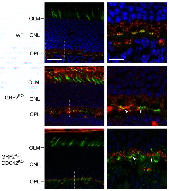 Analysis of cone photoreceptors and synaptic connections in WT, GRF2KO, and GRF2KO/CDC42KO retinas. Representative retinal immunofluorescence images after immunostaining for peanut agglutinin (PNA, green) and 14-3-3γ (red). The left panels identify the position of the PS, OML, ONL, and OPL layers in retinas of the indicated genotypes. Scale bar = 30 µm. The right panels show magnifications of the indicated insets (broken line squares) corresponding to regions of synaptic interactions of the cone photoreceptors in the OPL. Arrows point to areas of misalignment between 14-3-3γ and PNA in the OPL. Scale bar = 6 µm. OLM = outer limiting membrane; ONL = outer nuclear layer; OPL = outer plexiform layer. All genotypes: n = 3.