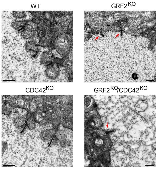 Electron microscopy analysis of ultrathin sections from WT and KO cone photoreceptor synapses. Representative electron microscopic images of the cone cell synaptic region of 1-month-old mice from WT, GRF2KO, CDC42KO, and GRF2KO/CDC42KO mice. Scale bars = 500 nm. Arrows point to areas of specific structural alterations in the ribbon synapses. WT (n = 3); CDC42KO (n = 4); GRF2KO (n = 2); GRF2KO/CDC42KO (n = 2).