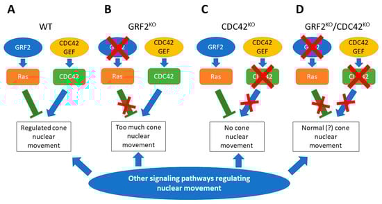 While our experimental observations appear to clearly exclude a direct functional participation of RAC1 in the control of nuclear positioning in the cone photoreceptors, we are further proposing here a mechanistic explanation (Figure 9) which is consistent with the known suppressing effect of GRF2 over various CDC42-mediated cellular processes [28,29,50], and with the somewhat counterintuitive effects on cone nuclear positioning resulting from the individual or combined ablation of GRF2 and CDC42 (Figure 2 and Figure 4). Our model would not imply a direct negative interaction of GRF2 over CDC42, but rather a more complex suppressing/balancing mechanism whereby the action of GRF2 on RAS proteins would suppress nuclear movement, while the activation of CDC42 by its specific cellular GEFs would play a positive balancing, stimulating effect on those nuclear movements. In this context, the ablation of both GRF2 and CDC42 in DKO retinas is associated with normal cone nuclear movement, implying that additional (still unknown) cellular factors must also be involved in the regulation of nuclear movements in the retinal cone photoreceptors.