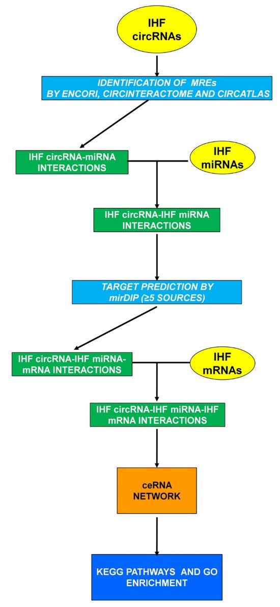 In order to identify a large-scale regulatory network among multiple RNA types constituted by circRNAs, miRNAs, and mRNAs in non-end-stage IHF patients, both bioinformatics and experimental analyses were performed following the workflow shown in Figure 1. A particularly stringent pipeline was adopted, taking advantage of independent techniques. This may introduce some biases and restrict the number of interactions identified, but the aim was to maximize specificity over sensitivity. The transcriptomic dysregulations characterizing the myocardium of non-end-stage IHF patients were evaluated experimentally. DE mRNAs (IHF DE mRNAs) and circRNAs (IHF DE circRNAs) were assessed by analyzing a newly generated transcriptomic dataset; a dataset including patients with similar characteristics was used to identify DE miRNAs (IHF DE miRNAs) [13]. The bioinformatics analysis identified miRNAs potentially interacting with the dysregulated circRNAs; these miRNAs were filtered for their dysregulation in IHF, assuming that the circRNA-miRNA interaction would lead to a counter-regulation [30,31,57]. Then, a bioinformatics analysis was used again to identify mRNAs potentially interacting with the selected miRNAs, and a second experimental filter was imposed, considering only those mRNAs displaying an opposite regulation with their targeting miRNAs. The resulting mRNAs were considered components of the circRNAs-miRNA-mRNA ceRNA-network characterizing IHF and were further analyzed for pathway enrichment analysis.