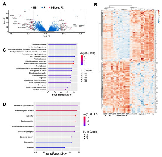 mRNA is differentially expressed in non-end-stage IHF patients. (A) Volcano plot of DE mRNAs between IHF and controls Vertical and horizontal dotted lines delimit red plots (p and log2 fold change) representing DE mRNAs with padj < 0.01 and log2 Fold Change >|1.0|, blue (P) plots representing mRNAs displaying a significant DE with padj ≥ 0.01 but with a log2 fold change < |1.0, and grey (NS) displaying no significant DE. (B) Heatmap showing each patient and control values expressed as Pearson’s correlation coefficient. The unsupervised clustering showed a perfect segregation of IHF from control samples. (C,D) Enriched top 20 KEGG pathways (C) and enriched OMIM diseases (D) from IHF DE mRNAs are represented by lollipop graphs. The size of the lollipop indicates the number of genes, and colors indicate the statistical significance (red for lower FDR, blue for higher FDR). For details on DE mRNAs, please refer to Supplementary Table S4A.
