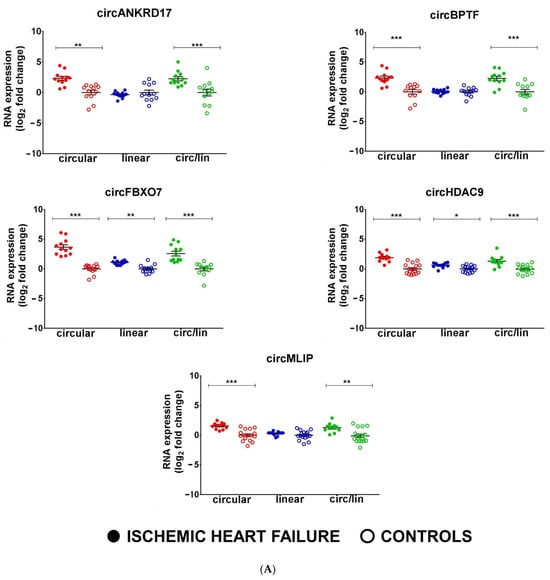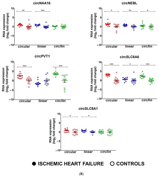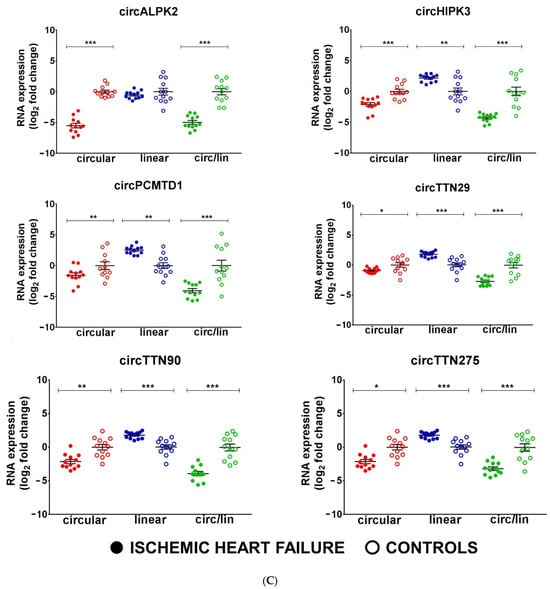circRNAs are deregulated in non-end-stage IHF patients. Total RNA was extracted from LV tissue from IHF patients (n = 12) and matched control subjects (n = 12). Dot-plots show circRNAs and host gene relative expression measured by qPCR and expressed as log2 fold change. The circ-to-linear ratio (circ/lin) indicates the circRNA enrichment compared to the host gene (linRNA). (A,B) show upregulated circRNAs, while (C) shows downregulated circRNAs. Mean values and error bars are indicated (* p < 0.05, ** p < 0.01, and *** p < 0.001).