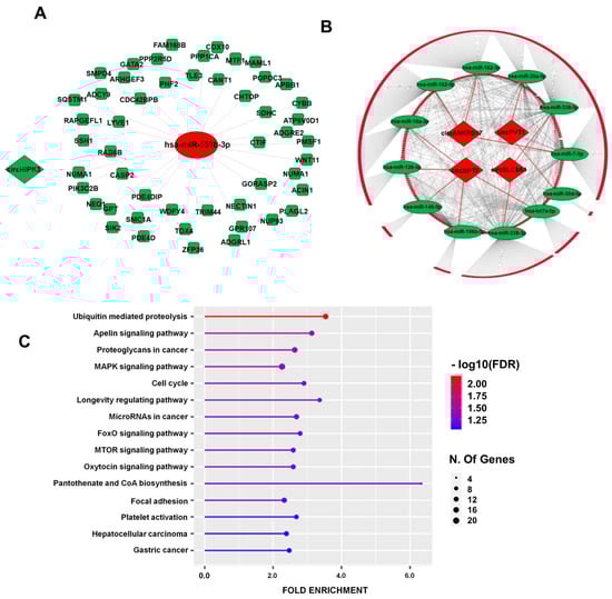 circRNA-driven circRNA–miRNA–mRNA regulatory network in IHF. circRNAs are indicated as diamonds, miRNAs as ovals, and mRNAs as rounded rectangles; green or red colors indicate down- or up-regulation in IHF, respectively. (A) The network is driven by down-regulated circHIPK3. (B) The network is driven by the up-regulated circRNAs; the inner circle is constituted by mRNAs targeted by multiple miRNAs, and the outer circle displays single miRNA-mRNA interactions (for details on mRNAs in the network, please refer to Supplementary Table S6). (C) The top 15 KEGG terms of the identified interacting mRNAs are represented by a lollipop graph and ordered by FDR enrichment. The size of the lollipop indicates the number of genes, and colors indicate the statistical significance (red for lower FDR, blue for higher FDR).