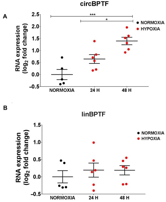 circBPTF induction by hypoxia in endothelial cells. HUVEC were cultured in 1% hypoxia or normoxic conditions for 24 or 48 h, and the expression levels of circBPTF (A) and linBPTF (B) were measured by RT-qPCR and expressed as log2 fold change. Only the expression of the BPTF circular form (A) was significantly increased in hypoxic conditions. Mean values and error bars are indicated (* p < 0.05 and *** p < 0.001).