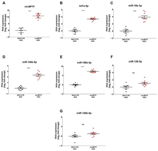 Let-7a-5p, miR-18a-3p, miR-146b-5p, and miR196b-5p enrichment in circBPTF pull-down. Biotinylated ASOs targeting the circBPTF back-splicing junction (circBPTF ASO) or biotinylated non-targeting control oligonucleotides (NEG CTR ASO) were used in pull-down experiments of HUVEC lysates. RNA bound to streptavidin-coated beads was extracted, and the levels of (A) circBPTF or (B–F) the miRNAs identified as interactors of circBPTF or (G) miR-125b-5p, which was not a circBPTF interactor (negative control), were assayed by RT-qPCR and expressed as log2 fold change. Mean values and error bars are indicated (n = 8, **** p < 0.0001). ns = not statistically significant.
