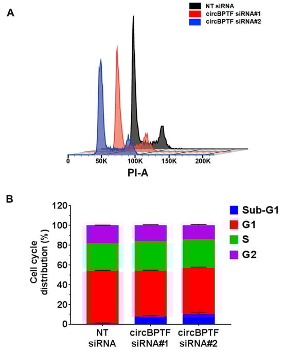 HUVEC proliferation inhibition by circBPTF silencing. Two siRNAs targeting the back-splice junction of circBPTF and a non-targeting siRNA control (NT siRNA) were transfected in HUVEC, and after three days, cell numbers were counted or flow cytometry cell analysis was performed. (A) Representative cell cycle profiles obtained by flow cytometry. (B) Quantitative analysis of the proportion of cells in each phase. A statistically significant decrease of the G1 (p < 0.001) and G2 (p < 0.01) phases and an increase of sub-G1 cells (p < 0.001) were observed in cells treated with both circBPTF siRNAs compared to non-targeting siRNAs. The bar graph shows the mean values and standard error of the data (n = 3).