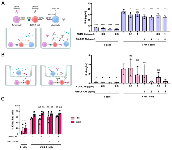CD40L and GM-CSF neutralization reduces IL-6 release. (A) Cell-to-cell-dependent CRS in vitro assay. The schematic of the experimental setup is shown on the left. Depicted is the co-culture of CD19-directed CAR T cells, Raji cells and monocytes in a 1:1:1 ratio in the absence (left) or presence (right) of antibodies that bind to CD40L or GM-CSF. Antibody-mediated neutralization is achieved either by capturing free GM-CSF or by blocking the CD40L-CD40R interaction. IL-6 levels were determined in the supernatant after 72 h. (B) Cell-to-cell-independent CRS in vitro assay. The schematic of the experimental setup is shown on the left. Depicted is the co-culture of CD19-targeting CAR T cells and Raji cells in the bottom well and the monocytes in the upper chamber at a 1:1:1 ratio in the absence (left) or presence (right) of CD40L or GM-CSF binding antibodies. IL-6 concentrations in the supernatants were determined after 72 h. (C) Cytotoxicity. To detect the fraction of dead cells by flow cytometry after 48 h, CD19+ Raji cells were labelled with CFSE prior to co-culture with CAR T cells in the presence or absence of neutralizing antibodies (N = 3). Dunnett’s multiple comparison test with the non-treated CAR T cell group as the control: ns, *, **, *** and **** indicate nonsignificant, p ≤ 0.05, p < 0.01, p < 0.001, and p < 0.0001, respectively.