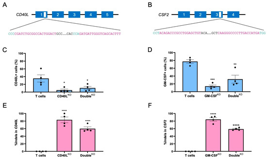 To validate the two targets, we sought to disrupt the genes coding for CD40L and GM-CSF in CAR T cells using CRISPR-Cas9 technology. To achieve efficient disruption, a so-called “double hit” strategy was applied by utilizing two targeted nucleases per locus simultaneously (Figure 2A,B). The Cas9 protein was complexed with the individual gRNA targeting either CD40L exon 1 or CSF2 exon 3, respectively, and transferred to CAR T cells using nucleofection. After eight days, the edited CAR T cells were subjected to phenotype and genotype analyses. The expression of CD40L and GM-CSF was measured by flow cytometry 4 or 24 h after activation with PMA/ionomycin, respectively. The evaluation of the edited CAR T cells confirmed efficient knockout with >80% reduction in CD40L-positive CAR T cells upon transfer of the CD40L-targeting CRISPR-Cas9 nucleases, and >70% reduction in GM-CSF+ cells upon editing with the CSF2-targeting designer nucleases (Figure 2C,D). The efficient knockout was maintained when disrupting both CD40L and CSF2 simultaneously to produce the DoubleKO CAR T cells The flow cytometric evaluation showed >70% reduction in CD40L+ cells and almost 60% reduction in GM-CSF+ cells (Figure 2C,D). Genotyping of the edited CAR T cells by sequence analysis of the target site using DECODR [17] confirmed the formation of insertion/deletion mutations (InDels) at the target sites (Figure 2E,F). Of note, the phenotypic knockout frequencies were well in line with the genetic analysis. The slightly lower knockout efficiency in the DoubleKO CAR T cells is related to the fact that in the DoubleKO samples, smaller amounts of RNP per target locus could be applied as compared to the single KOs (see Materials and Methods). Taken together, the generation of CD40LKO and/or GM-CSFKO CAR T cells using the CRISPR-Cas9 platform was successful with efficient disruption of the two loci, both individually and in combination.