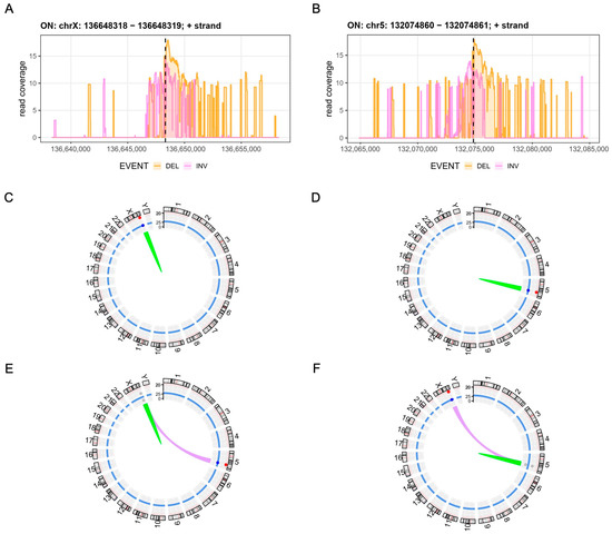 Evaluation of off-target effects. (A,B) On-target aberrations. Coverage plots show CAST-Seq reads mapped to a ± 10 kb region around the CD40L (A) or CSF2 (B) target sites. Sequencing direction is from left to right. The x-axis indicates the chromosomal coordinates, the y-axis the log2 read count per million, and the dotted line the cleavage site. Deletions (DEL) are shown in orange; inversions (INV) are shown in purple. (C–F) Structural variations. Circos plots display the structural variations detected in cells edited at CD40L (C) or CSF2 (D) individually or simultaneously using either CD40L (E) or CSF2 (F) as an anchor for CAST-Seq analysis. Aberrations at the on-target site are indicated in green, off-target mediated translocations in red (absent), and translocations between the CD40L and CSF2 target sites in purple.