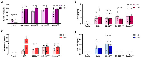 Antitumor activity of CD40L- and CSF2-edited CAR T cells. CD19-targeting CAR T cells were cultured with CD19+ Raji cells at effector/target (E:T) ratios of 1:1 and 2.5:1. (A) Cytotoxicity. Raji cells were labelled with CFSE prior to co-culture with CAR T cells to detect the fraction of dead cells by flow cytometry. (B–D) Cytokine release. Supernatants were collected after 48 h of co-culture and the concentration of IFN-γ, granzyme B and GM-CSF determined using cytometric bead array (N = 3 independent experiments, each in triplicate). One-way ANOVA test with the non-edited CAR T cell group serving as the control: ns, *, *** and **** indicate nonsignificant, p < 0.05, p < 0.0005 and p < 0.0001, respectively.