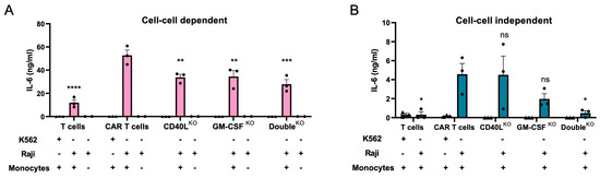 Impact of CD40L and/or GM-CSF knockout in CAR T cells on IL-6 release from bystander monocytes. (A) Cell-to-cell dependent effects. Shown are IL-6 levels in the supernatant of the co-culture of CD19-targeting CAR T cells, K562 or Raji cells, and monocytes at a 1:1:1 ratio. (B) Cell-to-cell independent. Shown are IL-6 levels in the supernatant of the co-culture of CD19-targeting CAR T cells, K562 or Raji cells, and monocytes in inserts at a 1:1:1 ratio (N = 3). Dunnett’s multiple comparisons test with non-edited CAR T cells serving as the control group: ns, *, **, *** and **** indicate nonsignificant, p < 0.05, p < 0.005, p < 0.0005, and p < 0.0001, respectively.