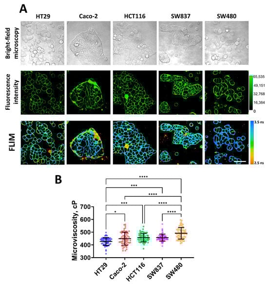 Quantitative analysis showed differences in the values of membrane microviscosity among cells of different lines (Figure 1B). It was found that HT29 cells have the most fluid membranes. The fluorescence lifetime of the rotor in their membranes was 2.95 ± 0.10 ns, which corresponded with a microviscosity value of 427 ± 30 cP. Caco-2, HCT116, and SW837 cells have slightly more viscous membranes compared to HT29, and their values of microviscosity were 448 ± 51 cP (3.03 ± 0.17 ns), 456 ± 33 cP (3.06 ± 0.11 ns), and 457 ± 27 cP (3.06 ± 0.09 ns), respectively. The highest microviscosity was detected for the membranes of SW480 cells—the fluorescence lifetime of the rotor in the membrane was 3.17 ± 0.14 ns, which corresponded with a microviscosity 491 ± 45 cP. The obtained microviscosity values are similar to those obtained in previous studies conducted on cancer cells using the FLIM technique [38,39,42].