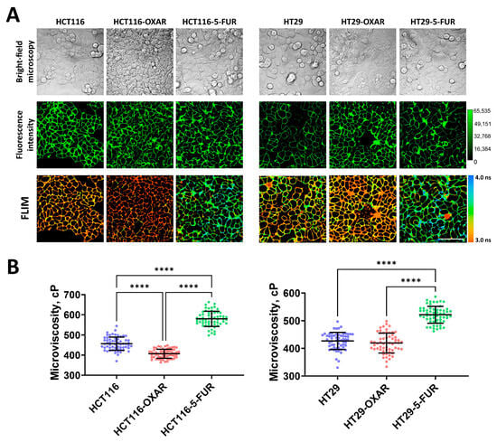 Membrane microviscosity in colorectal cancer cells resistant to oxaliplatin and 5-fluorouracil. (A) Representative bright-field microscopic, fluorescent, and FLIM images of colorectal cell sublines. Scale bar, 50 μm. BODIPY 2 (4.5 μM) was used as a viscosity-sensitive probe. Ex. 850 nm, reg. 500–550 nm. (B) Quantification of microviscosity of plasma membranes in resistant cancer cells. Mean ± SD, n = 60 cells. Scatter dot plot displaying the measurements for individual cell membranes (dots) and the means (horizontal lines) of microviscosity of different cell lines. Each dot is the mean value for 60 cells in 10 fields of view. Asterisks on the graphs indicate significance in the analysis: **** p < 0.0001.