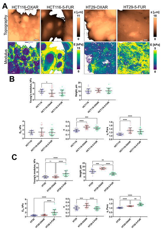 Nanomechanical analysis of colorectal cancer cells resistant to oxaliplatin and 5-fluorouracil. (A) Examples of AFM fast force–volume maps, topographies, and the corresponding apparent Young’s modulus maps. Scale bar, 10 μm. (B) Quantification of the apparent Young’s modulus and viscoelastic parameters of resistant cancer cells. (C) Quantification of the apparent Young’s modulus and viscoelastic parameters of HT29-OXAR and HT29-5-FUR cells. Scatter dot plot displaying the measurements for individual force maps (dots represent the mean value taken from the pixels above 50% of the maximum height, as defined by the corresponding topography images) and the mean ± SD (horizontal lines) of different cell lines. Asterisks on the graphs indicate significance in the analysis: * p ≤ 0.05, ** p ≤ 0.01, *** p ≤ 0.001, **** p < 0.0001.