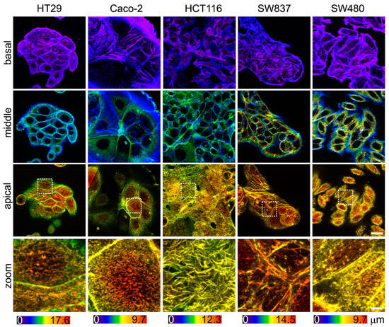 The actin cytoskeleton of colorectal cancer cells visualized via confocal microscopy. Color-coded z-projections of the F-actin staining divided into basal, mid-height, and apical regions. Bottom row: zoomed-in areas of the white square of the apical region, demonstrating large number of microvilli in HCT116 cells. Scale bar, 20 μm (4 μm for zoomed-in areas).
