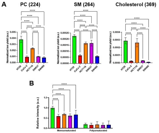ToF-SIMS analysis of membrane lipid composition in colorectal cancer cell lines. (A) Phosphatidylcholine (PC) (m/z 224), sphingomyelin (SM) (m/z 264), and cholesterol (m/z 385) ion yields were obtained in positive ions. (B) Mono- and polyunsaturated fatty acids were obtained in negative ions. Data on fatty acids were normalized to the saturated fatty acids signal of the corresponding sample. Mean ± SD. Asterisks on the graphs indicate significance in the analysis: **** p < 0.0001.