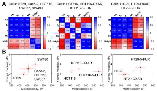 The correlation between the measured mechanical parameters of the colorectal cancer cells. (A) Heatmaps of the correlation matrix. Each variable is represented by a row and a column, and the cells show the correlation between them. The values of Pearson’s correlation coefficient (r) are presented in the cells and color coded according to the color scale bar. The analysis was performed for the groups of the five studied colorectal cancer cells, for the group of HT29, HT29-OXAR, and HT29-5-FUR cells, and for the group of HCT116, HCT116-OXAR, and HCT-116-5-FUR cells. YM = Young’s modulus; MV = microviscosity. (B) Graphs of Young’s modulus versus membrane microviscosity demonstrating the presence of correlations for the five studied colorectal cancer cells, for the group of HT29, HT29-OXAR, and HT29-5-FUR cells, but not for the group of HCT116, HCT116-OXAR, and HCT-116-5-FUR cells.