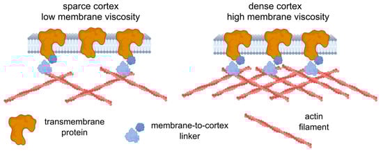 Further experiments are required to establish the origin of the observed correlation, yet we can speculate on the possible reasons. First, the increase in the concentration of transmembrane proteins should lead to an increase in the effective membrane microviscosity, since such proteins can be considered obstacles to lipid flow. There are theories describing such dependencies [1,100], but the quantitative description is beyond the scope of the present work. The immobilized transmembrane proteins can affect viscosity even more substantially, since they produce stable obstacles. Immobilization can be achieved via dynamic direct or indirect (e.g., via membrane-to-cortex linkers) linkage with the underlying actin cortex [27,88]. In turn, higher cortical stiffness can be related to the higher density of the actin cortex [101], which consequently allows for more attachment points between the transmembrane proteins and the cortex. Therefore, an increase in the actin density can affect both cell deformability (directly) and membrane viscosity (indirectly via the increasing fraction of the attached proteins) (Figure 8). Alternatively, an increase in the expression of the membrane–cortex linker proteins (ezrin, radixin, moesin (ERM)) may cause a decrease in membrane fluidity [102]. High levels of Ezrin were found to be associated with metastatic behavior in various types of cancer [103]. However, the observed correlation might not be absolute, as was shown here in chemoresistant HCT116 cells, and other factors (including lipid composition) can play a significant role in the maintenance of membrane fluidity.