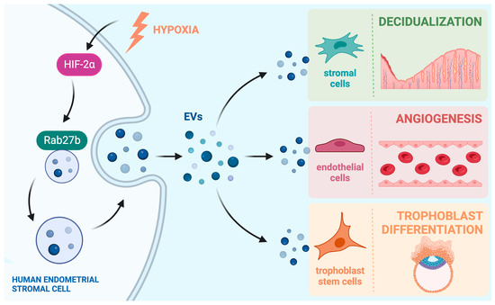 Endometrial EVs mediate cell-to-cell communication within the uterus. Production of EVs via differentiating human endometrial stromal cells is regulated by the hypoxia-inducible transcription factor HIF2α and its downstream target Rab27b, which controls vesicular trafficking. The EVs secreted by the stromal cells are taken up by stromal, endothelial, and trophoblast cells in the uterine milieu to induce changes in their functions. In this way, EVs play a vital role in supporting decidualization, blood vessel formation, and trophoblast development, which are integral parts of implantation and placentation during early pregnancy. Created in BioRender.com (10 July 2023).