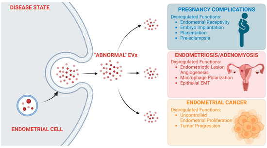 EVs are a powerful mechanism for signaling within the body, and as such, tight regulation of their synthesis and secretion is crucial for normal body function. Any changes from normal EV signaling can be the cause of deleterious effects throughout the body. EV signaling and its role in cancer progression and metastasis have been well documented [64,65,66]. Aberrant EV signaling has also been linked to neurodegenerative disorders [67], diabetes [68], and rheumatoid arthritis [69], among other pathophysiological conditions. Unsurprisingly, dysregulation of endometrial EV signaling also can lead to several pathophysiological conditions in the reproductive tract (Figure 2).