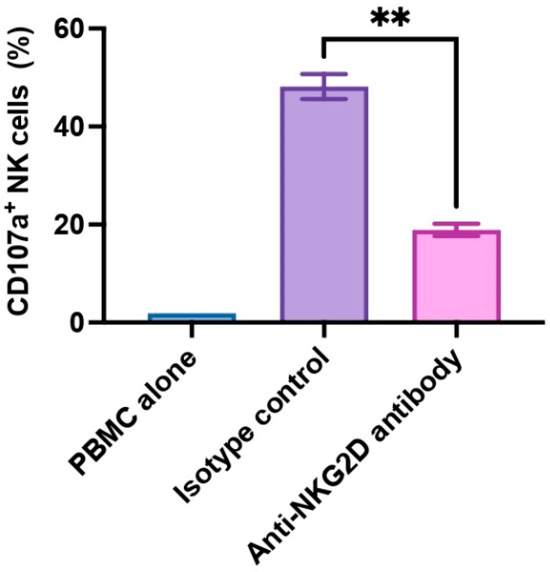 In the present study, we utilized PBMCs to allow for a more physiologically representative NK cell activation to account for interactions with other immune cells. In healthy individuals, NK cells constitute approximately 5–15% of the total PBMC population. NK cell activation often depends on cytokine signals, such as IL-2 and IL-15, and these signals originate from T cells or other immune cells [31]. We assessed human NK cell activation by monitoring CD107a expression within the CD3-CD56+ subset (NK cells). CD107a is also known as lysosomal-associated membrane protein-1 (LAMP-1), and CD107a serves as a functional indicator for NK cell activation in that CD107a surface expression correlates with cytokine production as well as NK cell-mediated cytotoxicity [32]. In our experiment, we examined PBMCs from three donors (n = 3), and we found that anti-NKG2D antibody exhibited strong inhibitory effects on NK cell activation. The presence of anti-NKG2D antibody led to a significant reduction in CD107a expression on NK cells compared to isotype control antibody (p < 0.01, 18.87% ± 1.24% vs. 48.13% ± 2.55%) upon WT pig cell stimulation (Figure 1). These findings confirm the pivotal role of NKG2D receptor and its ligands in activating NK cells.
