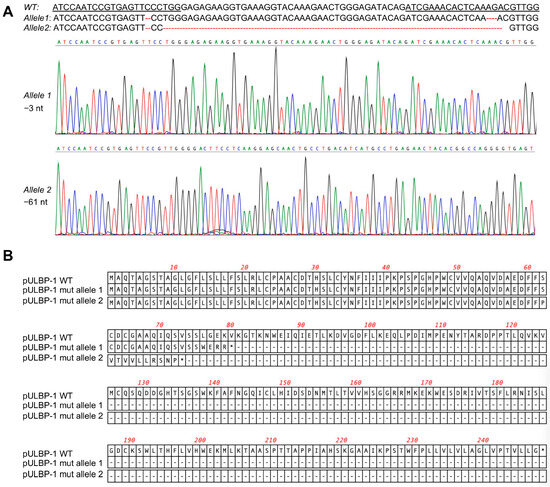 Elimination of pULBP-1 in pig endothelial cells. (A) Disruption of pULBP-1 gene. CRISPR/Cas9 gRNAs targeted pULBP-1 DNA sequences were underlined. The missing nucleotides were marked using dash line in red. Sanger DNA sequencing chromatograms of the two pULBP-1 mutant alleles in 6GKO were shown. Three nucleotides were deleted in allele 1, and sixty-one nucleotides were missing in allele 2. (B) Translation of mutated pULBP-1. Deletion of 3 nucleotides in allele 1 led to a truncated pULBP-1 with 79 amino acids. Deletion of 61 nucleotides in allele 2 led to a truncated pULBP-1 with 72 amino acids.