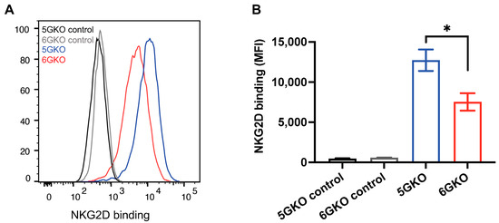 The interaction of pULBP-1 ligand and human NKG2D receptor has been previously reported [24,33]. To determine whether the binding of NKG2D to pULBP-1-deficient porcine cells was altered, 6GKO and 5GKO cells were incubated with a recombinant human NKG2D-Fc chimera protein, followed by the staining with Alexa Fluor® 488 AffiniPure F(ab’)2 Fragment Donkey Anti-Human IgG, Fcγ fragment-specific. A representative flow cytometry result showed that human NKG2D-Fc binding to 6GKO cells was reduced compared to the binding to 5GKO cells (Figure 3A). The mean fluorescent intensity (MFI) of NKG2D-Fc binding was 7527 ± 1081 for 6GKO and 12,729 ± 1331 for 5GKO (presented as mean ± SEM). 6GKO cells exhibited 40.9% reduction in binding to NKG2D-Fc protein compared to the parental 5GKO cells (p < 0.05, n = 3) (Figure 3B). This result demonstrated the absence of the pULBP-1 protein on 6GKO cells as well as the presence of unidentified ligands on pig cells that can bind to the human NKG2D-Fc protein.