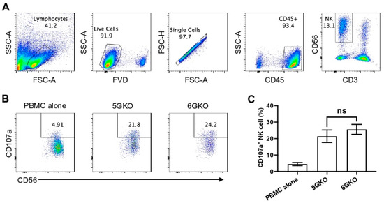 NK cell activation was assessed by CD107a degranulation assays as previously reported [29]. Buffy coats were purchased from Versiti Indiana Blood Center. Fresh whole blood was drawn from two volunteers according to the guidelines of the Institutional Review Board (IRB) of Indiana University, IRB#11013. Ficoll-Paque Plus (GE-Healthcare, Pittsburgh, PA, USA) and Lymphoprep (STEMCELL Technologies, Vancouver, Canada) gradient centrifugations were used to isolate human peripheral blood mononuclear cells (PBMCs) from buffy coats and fresh whole blood, respectively. PBMCs were cultured in the RPMI1640 medium supplemented with 10% FBS, 1% penicillin/streptomycin, and 20 ng/mL recombinant human IL-2 (rhIL-2) (BioLegend, San Diego, CA, USA) at 37 °C in a 5% CO2 incubator for 5 days. The day before co-culture, 5GKO and 6GKO cells were seeded at 5 × 104 per well in a Biocoat collagen I-coated 48-well plate (Corning Incorporated, Corning, NY, USA). PBMCs treated with rhIL-2 were added to pig endothelial cells at 5 × 105 per well and the cells were co-cultured for 2 h at 37 °C in a CO2 incubator. For antibody blocking studies, rhIL-2 treated PBMC were pre-incubated with anti-NKG2D antibody and isotype antibody at 10 µg/mL (BioLegend, San Diego, CA, USA) at 4 °C for 30 min, then co-cultured with pig cells for 2 h at 37 °C in a CO2 incubator. Co-cultured cells were collected and stained with fixable viability dye eFluor 780 (Thermo Fisher Scientific, Waltham, MA, USA) to distinguish between live and dead cells, followed by staining with fluorochrome-conjugated antibodies against human CD45, CD3, CD56, and CD107a (BioLegend, San Diego, CA, USA). After fixing with 2% paraformaldehyde (PFA), stained cells were then acquired using an LSRFortessa flow cytometer (BD Biosciences, Franklin Lakes, NJ, USA) and analyzed using FlowJo v10 software (BD Biosciences, Franklin Lakes, NJ, USA). NK cell activation was assessed by the frequency of CD107a-expressing cells within the live singlet CD45+ CD3-CD56+ NK cell population.