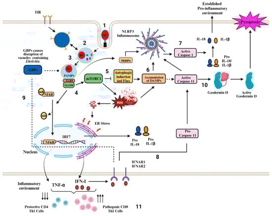 Model of Activation of canonical and non-canonical Inflammasome Pathways during severe and potentially fatal Ehrlichia infection. (1) Dense core cells enter macrophages. (2) Bacteria replicate within an Ehrlichia-containing vacuole (ECV) resembling early endosomes, secreting type I and type IV secretion system effectors including TRP32, TRP47, TRP120, and Ank200. (3) Dense core cells differentiate into reticulate cells and fuse with TfR endosomes to acquire iron and disrupt host cell signaling. (4) Ehrlichia PAMPS or DAMPS generated in infected cells such as mitochondrial DAMPS induces TLR9/MYD88 downstream targets, activating the NF-κB pathway. Activated NF-κB acts as a transcription factor to upregulate NLRP3, TNF-α, pro-caspase 1/11, pro-IL-1β, and pro-IL-18 providing the first signal required for the activation of canonical inflammasome pathway. (5) MYD88 signals in infected macrophages also cause a block of autophagy induction via mTORC1 activation as well as blocking autophagy flux causing defective mitophagy and mitochondrial damage/dysfunction and ER stress. (6) MyD88 mediated block of autophagy flux triggers an accumulation of DAMPS such as mtDNA or ROS. (7) Canonical NLRP3 inflammasome activation occurs via unknown mechanisms, but it may involve recognition of DAMPs and/or Ehrlichia PAMPs secreted to the cytosol via type I and type IV secretion systems. NLRP3 signaling leads to Caspase 1 activation and the subsequent cleavage of pro-IL1β and pro-IL-18 into their mature forms. (8) Ehrlichia also triggers the upregulation of IRF7 and the production of Type I IFN cytokines, which signal via the type I IFN receptor (IFNAR) and positively regulate activation of non-canonical inflammasome pathways leading to Caspase 11 activation. (9) The PAMPs that trigger Caspase 11 activation during infection with LPS negative Ehrlichia is unknown, but it is possible that IFN-1 and IFNAR signaling induce GBPs, which may disrupt Ehrlichia-containing vesicles, releasing PAMPs to the cytosol. (10) Activation of the non-canonical inflammasome pathway marked by Caspase 11 activation leads to the cleavage of Gasdermin D and a release of IL-1β and IL-18 in addition to pyroptosis of the host cells causing tissue damage. (11) Excessive inflammation secondary to inflammasome activation, together with inflammatory cell death promotes the expansion of pathogenic cytotoxic CD8+ T cells, causing further cytotoxic cell death and extensive tissue damage. The MYD88-induced block of autophagy may negatively impact MHC-II antigen presentation and may lead to the attenuated activation and proliferation of protective CD4+ Th1 cells, which in turn promote bacterial replication and dissemination. (Biorender.com, (accessed on 1 October 2023)).