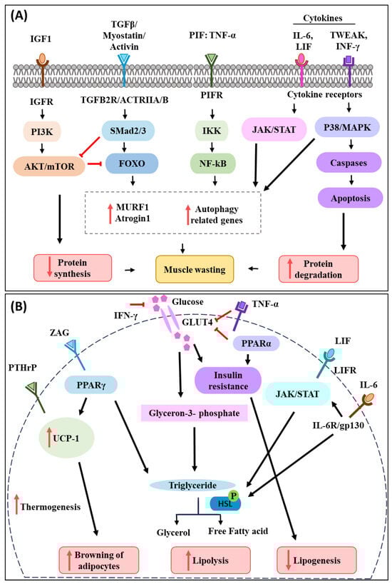 Schematic diagram of the most common signalling pathways active in muscle and adipocytes during cancer-associated cachexia. (A) During cancer-associated cachexia, several pro-inflammatory cytokines are secreted by the cancer cells. TWEAK, IFN-γ, TNF-α, IL-6, and LIF were found to enhance muscle catabolism via the p38/MAPK, NF-κB, and JAK/STAT pathways. TGFβ and members of its superfamily, including myostatin and activin, have been shown to induce muscle atrophy by stimulating FOXO, which in turn activates proteosome pathways. IGF-1 tends to trigger PI3K-AKT and mTOR signalling in muscle, enhancing protein synthesis. However, IGF-1 levels reduce during cancer-associated cachexia, which in turn affects muscle protein turnover and contributes to muscle atrophy. (B) Inflammatory cytokines, LIF, ZAG, and PTHrP released by the tumour cells also participate in adipose tissue wasting during cancer-induced cachexia. TNF-α mediates adipose wasting by decreasing GLUT4 expression, which results in inhibition of glucose transport and lipogenesis. Similarly, IFN-γ and PPARα stimulate lipolysis by inducing insulin resistance through recduction in glucose uptake. IL-6 and LIF were found to induce adipose lipolysis by activating the JAK/STAT signalling pathway, which causes HSL phosphorylation and therefore fat degradation. PTHrP activates UCP-1 in adipocytes, which results in browning of adipose tissue, and phosphorylation of HSL, which causes lipolysis. ZAG acts as a lipid mobilizing factor and stimulates adipose tissue wasting. Overall, inflammatory cytokines and cachectic factors released by the cancer cells activate various signalling pathways that lead to muscle and adipose wasting and together contribute to body weight loss during cancer-associated cachexia.