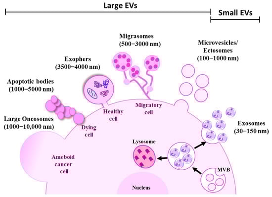 Extracellular vesicles (EVs) are nano-sized membrane enclosed vesicles produced by all cell types, including cancer cells. EVs are released into the circulation and they transport functional information to distant sites []. Extracellular vesicles have been classified into different categories based on their origin, size, and mode of biogenesis [,]. EVs can be broadly classified into small and large EVs []. Small EVs include exosomes (30–150 nm) and ectosomes or shedding microvesicles (100–1000 nm), and large EVs include apoptotic bodies (1000–5000 nm), migrasomes (500–3000 nm), exophers (3500–4000 nm), and large oncosomes (1000–10,000 nm) [] (Figure 2).