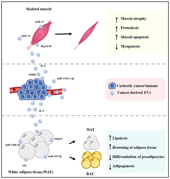 It is of no surprise that different types of tumours or cancer cells produce numerous tumour-derived EVs with a variety of distinct cargoes that are implicated in controlling various biological processes, disease progression, and the metabolic state of the body []. There is a growing body of evidence to support the idea that tumour-derived EVs can initiate adipocyte browning, lipolysis, and muscle atrophy during cancer-associated cachexia via noncoding RNA cargo contained within EVs (Figure 3 and Table 1).