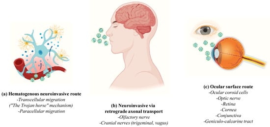 In this connection, several both direct and/or indirect routes for the invasion of SARS-CoV-2 into the nervous system (Figure 3) have been proposed [,,,,]: