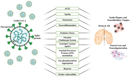 Nevertheless, among the long-term manifestations of post-COVID-19, AD-like dementia stands out as the most frequent disorder with higher susceptibility of subjects exposed to the SARS-CoV-2 infection toward more severe clinical outcomes []. Relevantly, even though COVID-19 and AD have different clinical presentations, there are multiple, neurological, psychiatric and ophthalmological, physiopathological aspects linking with each other and increasing the patients’ complications and mortality.