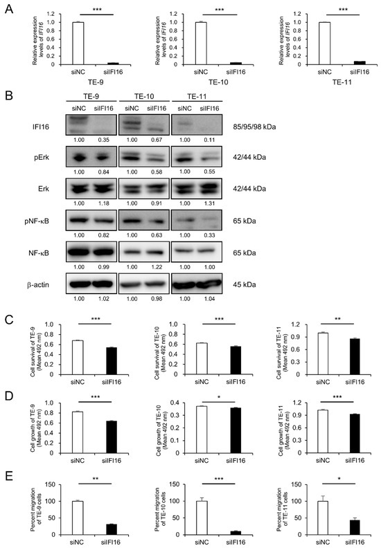 To evaluate the contribution of IFI16 to enhanced malignant phenotypes in directly co-cultured ESCC cell lines, IFI16 expression in ESCC cells was silenced using siRNA. The silencing of IFI16 was confirmed with qRT-PCR and Western blotting (Figure 2A,B and Figure S4B). IFI16 silencing suppressed the phosphorylation of both Erk and NF-κB in the three ESCC cell lines (TE-9, TE-10, and TE-11) compared with the siNC-transfected ESCC cell lines (Figure 2B and Figure S4B). In addition, MTS and Transwell migration assays were conducted to evaluate the effect of IFI16 silencing in the malignant phenotypes of ESCC cell lines. The results demonstrated the suppression of survival, growth, and migration in the IFI16-silenced ESCC cell lines compared to the siNC-transfected ESCC cell lines (Figure 2C–E and Figure S3A).