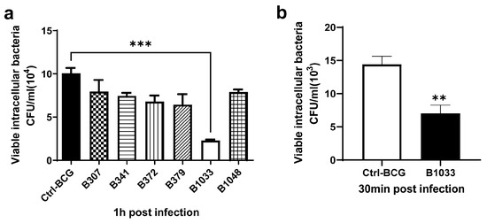 Figure 1. Invasion and adhesion assays of BCG strains. A549 cells were infected with BCG strains at an MOI of 10 for 30 min at 4 °C for adhesion assay and 1 h at 37 °C for invasion assay. The numbers of intracellular BCG were quantified using CFUs. (a) Invasion ability of different BCG mutants. (b) Adhesion ability of B1033 mutant and BCG. Each sample was plated in triplicate. Data are presented as means ± SEMs. ** p < 0.01 and *** p < 0.001.