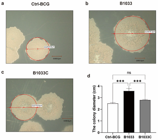 Figure 2. Morphology and diameter of single colonies of wild-type (a), B1033 (b), and B1033C (c) BCG strains. (d) Diameter of wild-type colonies (ctrl-BCG), B1033, and B1033C BCG strains. ns p > 0.05; *** p < 0.001.