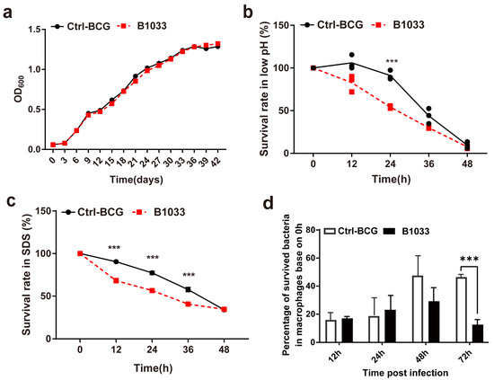 Figure 3. Extracellular and intracellular survival of B1033. Survival rate of B1033 and wild-type BCG (Ctrl-BCG) strains incubated in (a) 7H9 medium at 37 °C, (b) low pH (pH 4.5) 7H9 liquid medium, (c) 7H9 liquid medium containing 0.05% SDS, and (d) THP-1 cells. *** p < 0.001.