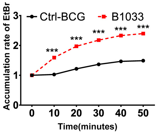 The robust lipophilic cell wall of mycobacteria serves as a vital physical barrier, safeguarding them against adverse intracellular environments [25,26,27]. To ascertain the function of fadD33, we conducted cell permeability assays. Significantly, there was a notable increase in EtBr accumulation in the B1033 group compared to the control group, observed as early as 10 min post-EtBr treatment (p < 0.001) (Figure 4). This suggests that the absence of fadD33 in BCG increased cell wall permeability.
