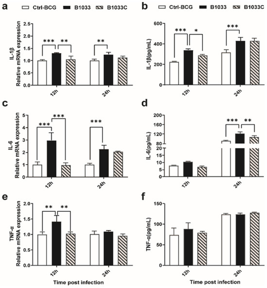 Figure 6. Expression of IL-1β, IL-6, and TNF-α in THP-1 cells. THP-1 cells were infected with wild-type BCG, B1033, and B1033C strains. The mRNA levels of (a) IL-1β, (b) IL-6, and (c) TNF-α were detected using RT-qPCR and normalized to β-actin. Cytokine protein levels of (d) IL-1β, (e) IL-6, and (f) TNF-α were detected using ELISA. * p < 0.05; ** p < 0.01; *** p < 0.001.