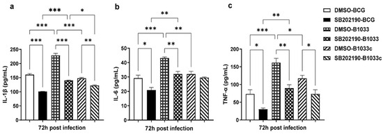 Figure 7. IL-1β, IL-6, and TNF-α expression in THP-1 cells after p38 inhibition. PMA-differentiated THP-1 macrophages were treated with a p38 inhibitor (SB202190, 10 µM) or dimethyl sulfoxide (DMSO) for 2 h and then infected with wild-type (BCG), B1033, and B1033C strains at an MOI of 10. IL-1β (a), IL-6 (b), and TNF-α (c) expressions were detected via ELISA 72 h PI. * p < 0.05, ** p < 0.01, *** p < 0.001.