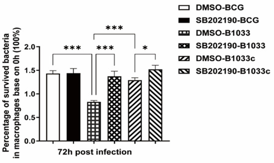 Figure 8. Intracellular survival of BCG after p38 inhibition. PMA-differentiated THP-1 macrophages were treated with a p38 inhibitor (SB202190, 10 µM) or DMSO for 2 h and then infected with wild-type (BCG), B1033, or B1033C strains at an MOI of 10. Survival, expressed as CFU/mL, was assessed at 0 and 72 h PI. The intracellular survival of BCG after 72 h is expressed as a percentage of that at 0 h. * p < 0.05, *** p < 0.001.