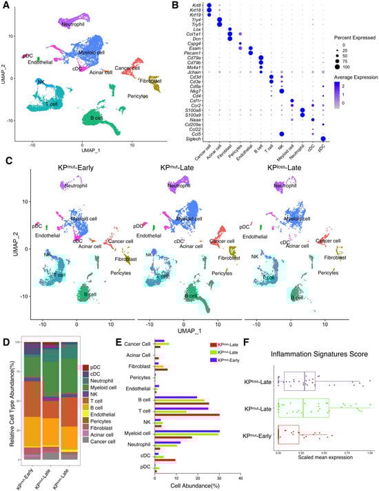 First, we included our recently published single-cell RNA-sequencing (scRNA-seq) datasets [,] to compare two mouse models with autochthonous pancreatic ductal adenocarcinoma (PDAC): the KPmut (KrasG12D; Trp53R172H) mouse model with KRASG12D mutation and p53R172H mutation, as compared to the KPloss (KrasG12D; Trp53cKO) mouse model with KRASG12D mutation and p53 loss (Figure 1A,B). We then compared the primary tumors across various cell types from early-stage KPC mice (KPmut-Early), late-stage KPC mice (KPmut-Late), and late-stage KPPF mice (KPloss-Late) (Figure 1C). Our analysis revealed significant differences in the composition of major cell populations between the KPmut-Early, KPmut-Late, and KPloss-Late (Figure 1D,E). As PDAC progressed in the contexts of different p53 alterations, the composition of cancer cell subpopulations significantly altered. Notably, a unique cancer cell subtype was present in the tumors of KPmut-Late mice but not KPloss-Late mice (Figure 1C). Cell number and phenotype alterations in neutrophils, fibroblasts, and other cell types were also observed (Figure 1C–E). T and B cell numbers were relatively high in KPmut-Early tumors and significantly decreased in KPmut-Late and KPloss-Late tumors (Figure 1D,E). Myeloid cell numbers in KPmut-Late and KPloss-Late were far beyond the KPmut-Early (Figure 1D,E). These results indicate that decreased lymphocyte number and increased myeloid cell number are associated with late-stage PDAC regardless of p53 alteration subtypes. Additionally, we utilized a recently reported methodology of analyzing the inflammation-related signals [] and observed a significant increase in inflammation scores in KPmut-Late and KPloss-Late samples (Figure 1F), indicating the enrichment of inflammation-related signals in late-stage tumors but not in early-stage tumors.