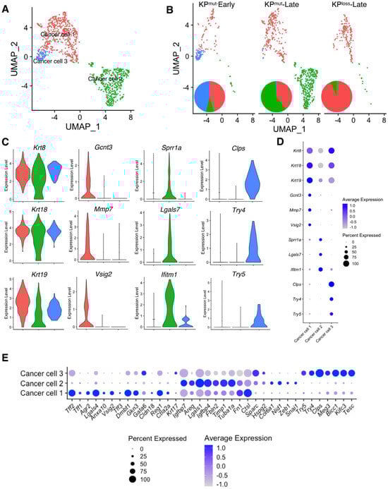 Based on our analysis, we have identified three distinct subclusters of cancer cells, namely ‘Cancer cell 1’, ‘Cancer cell 2’, and ‘Cancer cell 3’, as shown in Figure 2A. Specifically, Cancer cell 1 was present in all three groups, as the predominant cancer cell subtype in KPmut-Early and KPloss-Late tumors (Figure 2B). Cancer cell 2 was mainly enriched in KPmut-Late tumors, whereas Cancer cell 3 was mainly enriched in KPmut-Early tumors (Figure 2B). To further investigate the similarities and differences between these three subpopulations of cancer cells, we analyzed the marker genes of these cancer cell subtypes. As expected, all three subtypes of cancer cells expressed the generic pancreatic cancer cell marker genes, such as Krt8 and Krt18 (Figure 2C,D). Specifically, Cancer cell 1 expressed Gcnt3, Mmp7, and Vsig2, which are associated with the epithelial/classical subtype of pancreatic cancer cells [,,] (Figure 2C,D). Cancer cell 2 expressed Sprr1a, Lgals7, and Ifitm1, which are associated with the mesenchymal/basal-like subtype and a poor prognosis in PDAC [,,]. Cancer cell 3 represented the early-stage cancer-initiating cells with the expression of acinar cell genes such as Clps, Try4, and Try5 (Figure 2C,D), as well as epithelial marker genes such as Epcam and Cdh1 (Supplementary Figure S1A).
